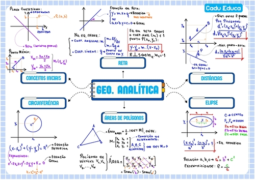 O Mapa Mental de Geometria Analítica do Cadu Educa traduz essas fórmulas em um guia visual organizado.