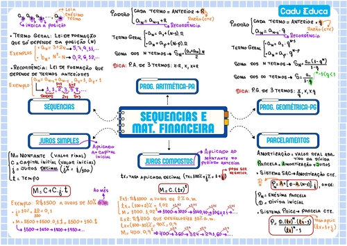 Muitos alunos decoram dezenas de fórmulas separadas e acabam se confundindo na hora da prova. O Mapa Mental de Sequências e Matemática Financeira do Cadu Educa une esses dois mundos para você estudar de forma inteligente.